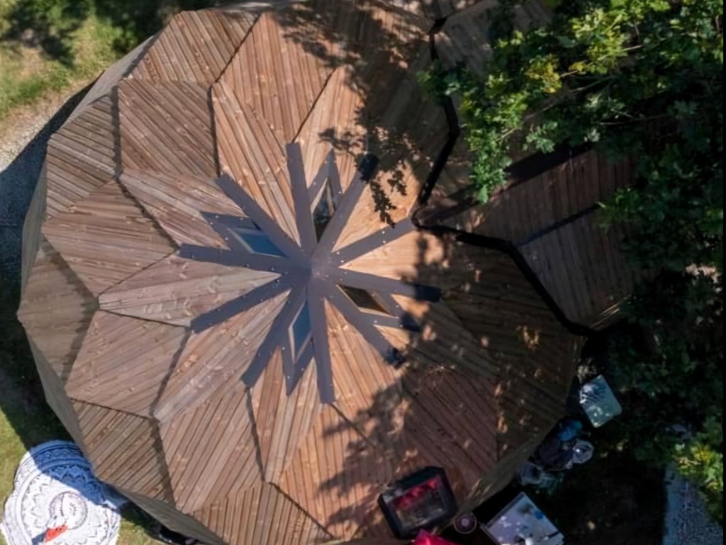 Par défaut, je propose une couverture en panneaux de bardage bois (pin traité classe 4, ou douglas ou mélèze). Ces panneaux sont préparés en atelier, ce qui permet une pose plus rapide lors du montage. Je privilégie le bardage à recouvrement pour les zomes, et pour les dômes le bardage à joints epdm. La durée de vie estimée des panneaux est de 15 à 20 ans.