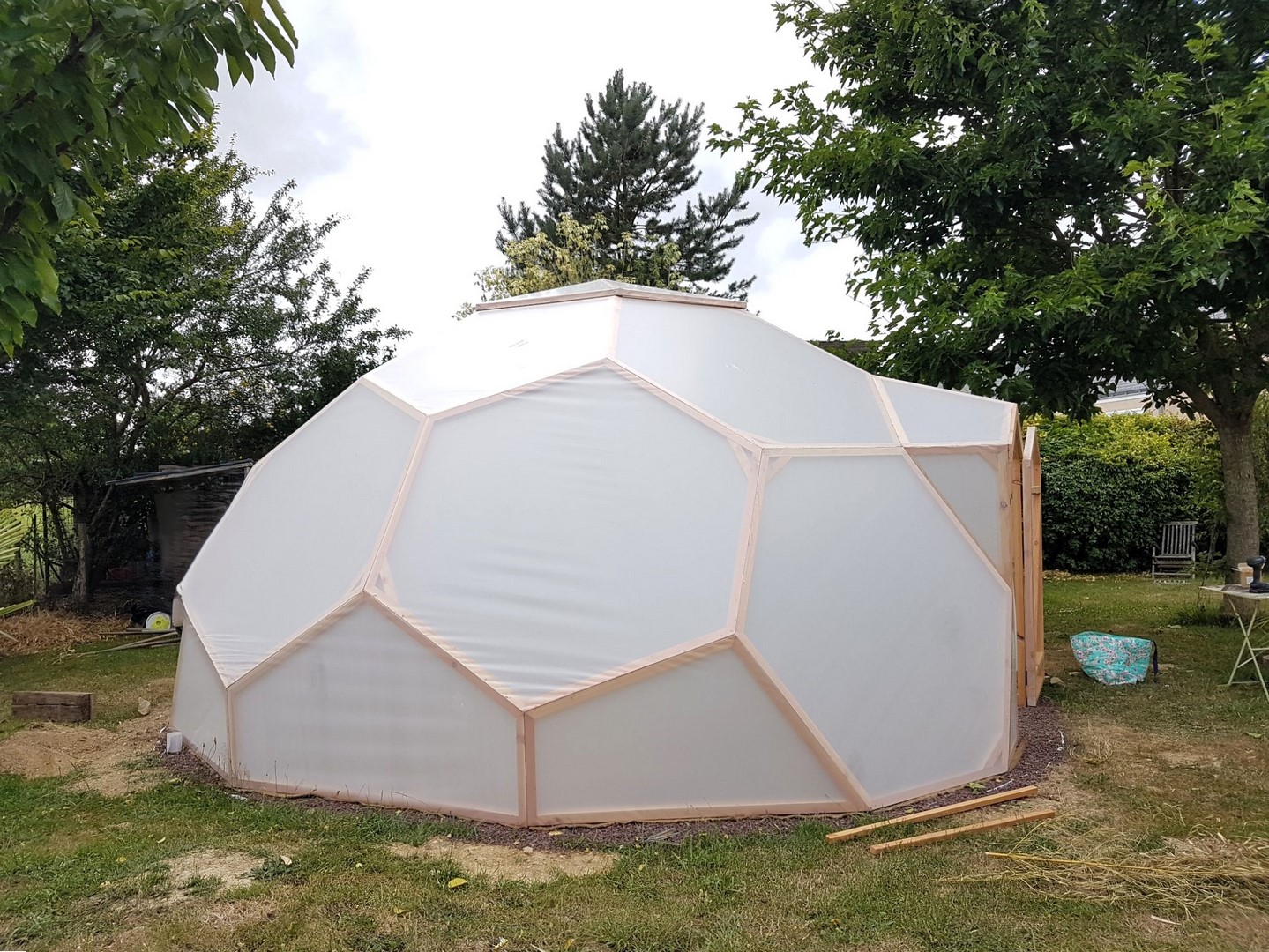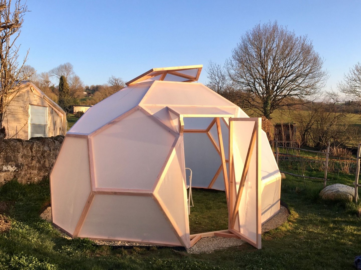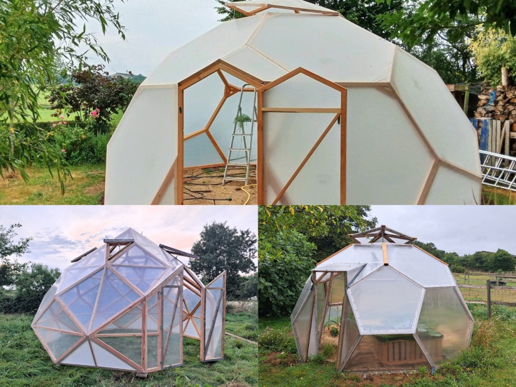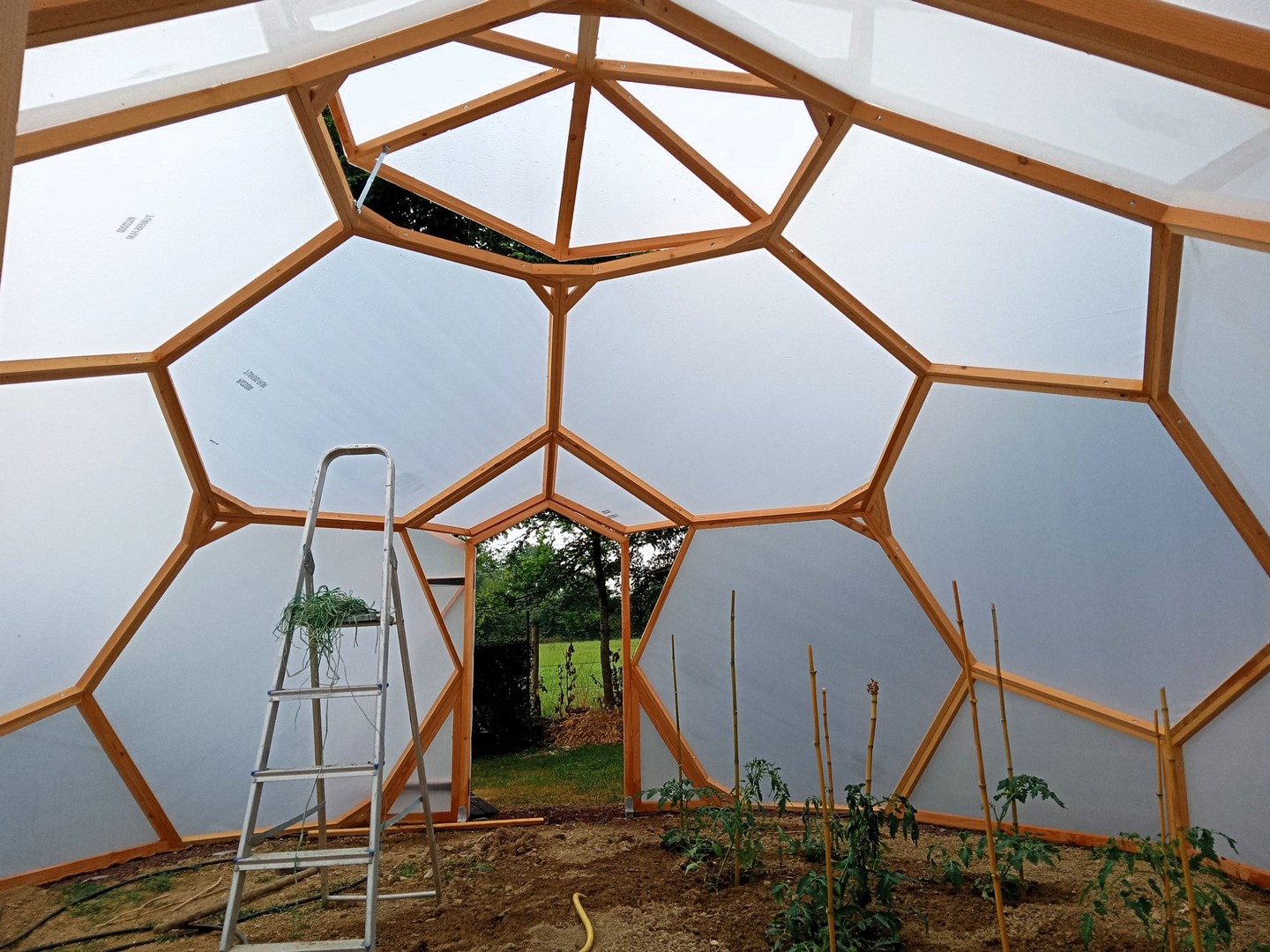 Serre zome en bois, Diamètre : 4 m 60 (13 m² au sol), Hauteur : 3 m10, Porte : 180 x 100 cm