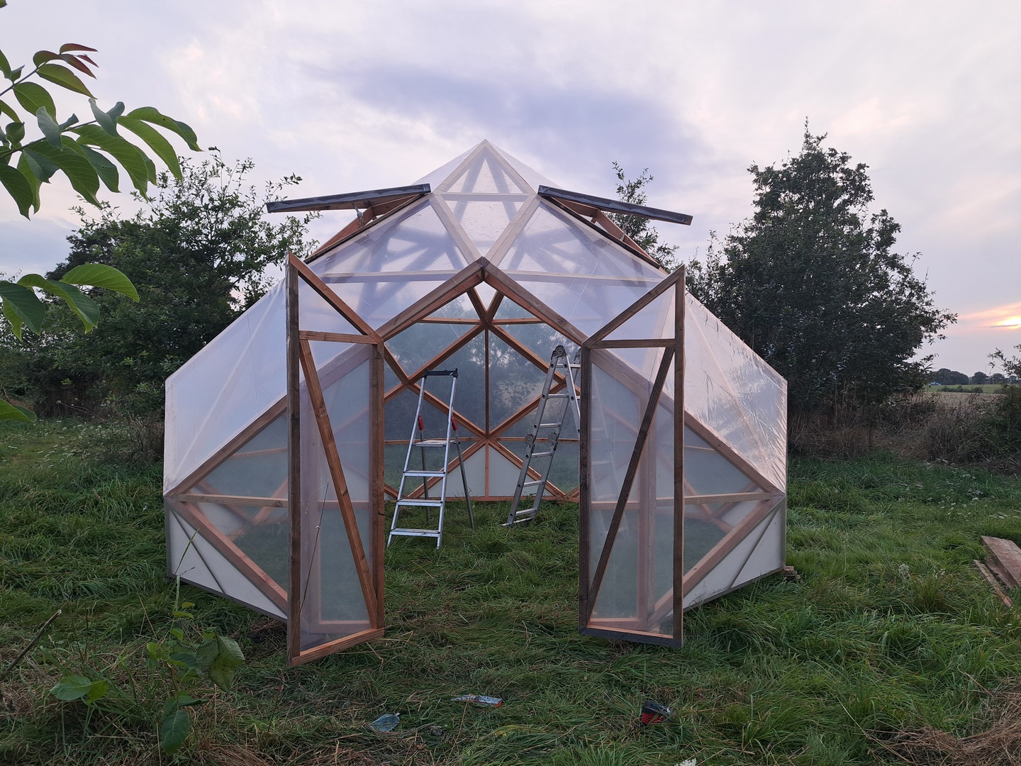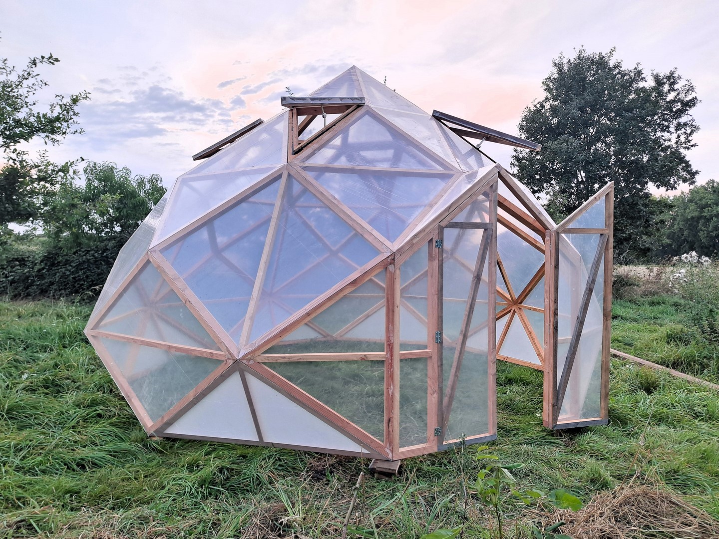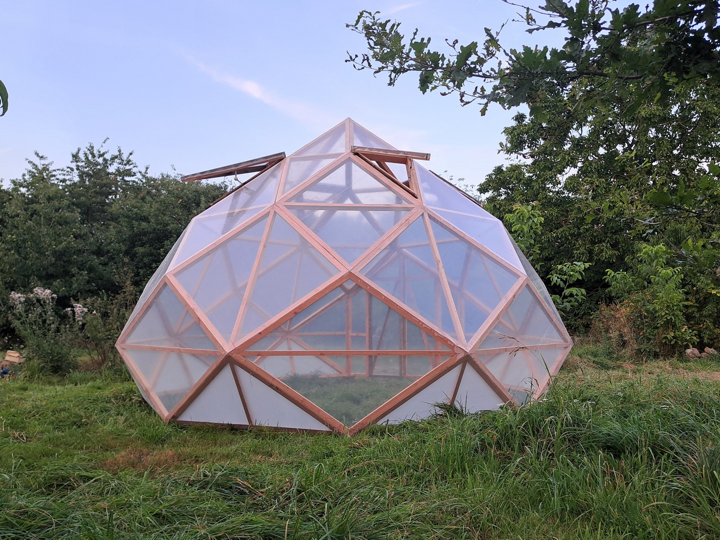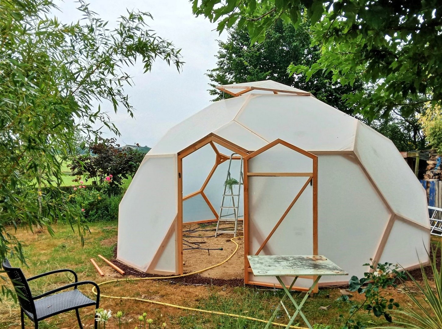 Serre zome en bois, Diamètre : 4 m 60 (13 m² au sol), Hauteur : 3 m10, Porte : 180 x 100 cm