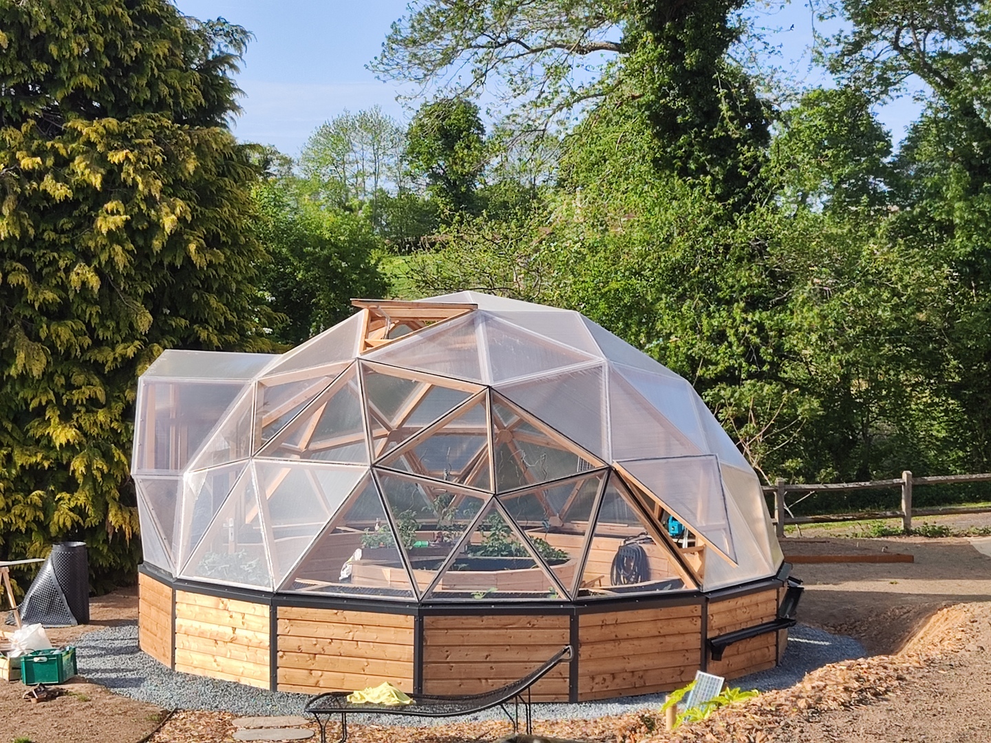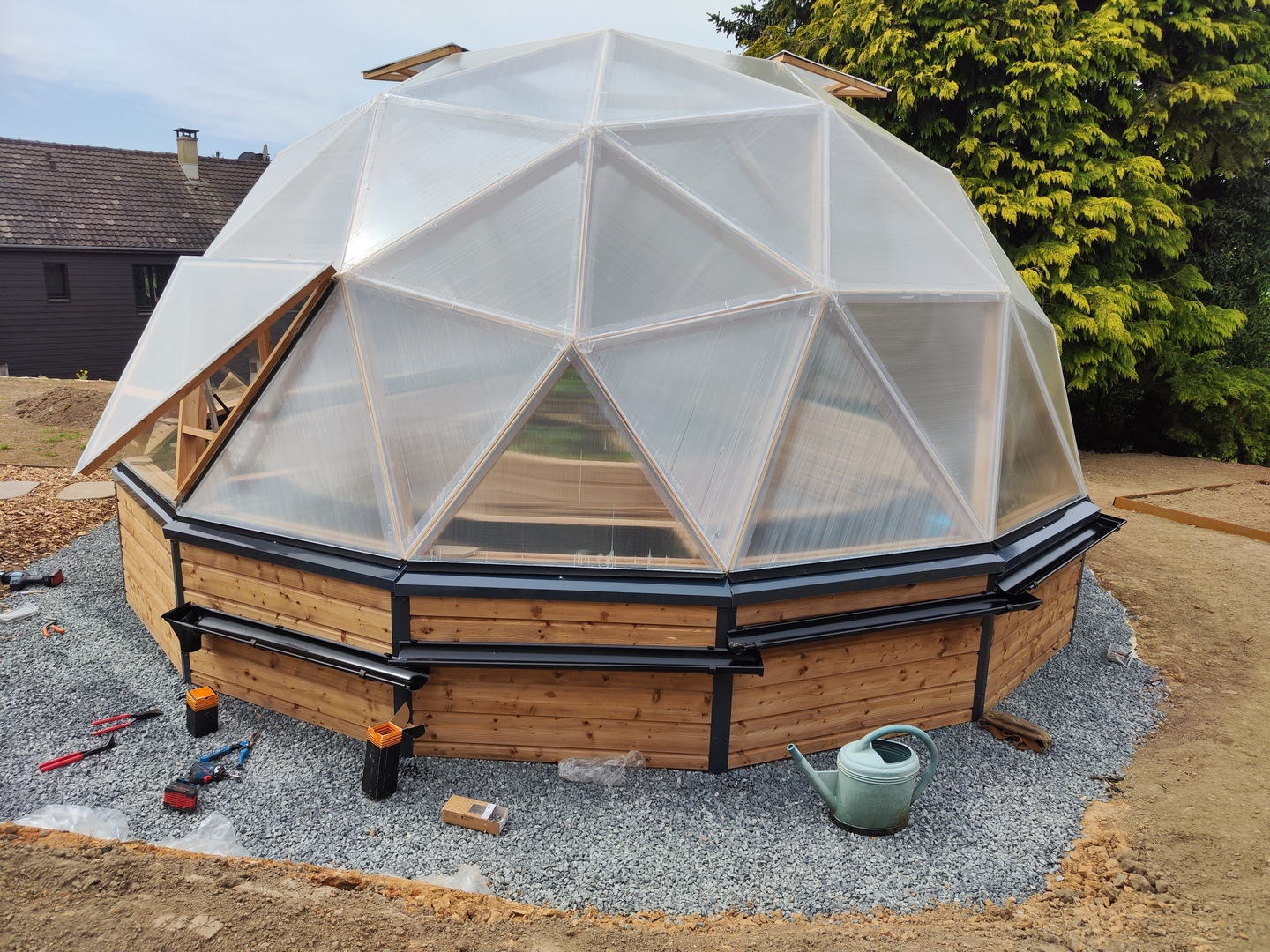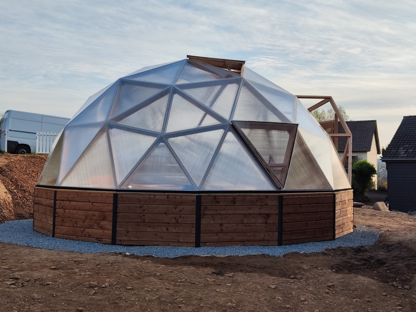 Dôme F3 5/12èmes de sphère sans connecteurs, sur réhausse 60 cm isolée, couverture en bardage bois et polycarbonate alvéolé, porte-fenêtre double battants 120 x 205, fenêtre sur vérins automatiques, jardinières périphériques et ilot central.