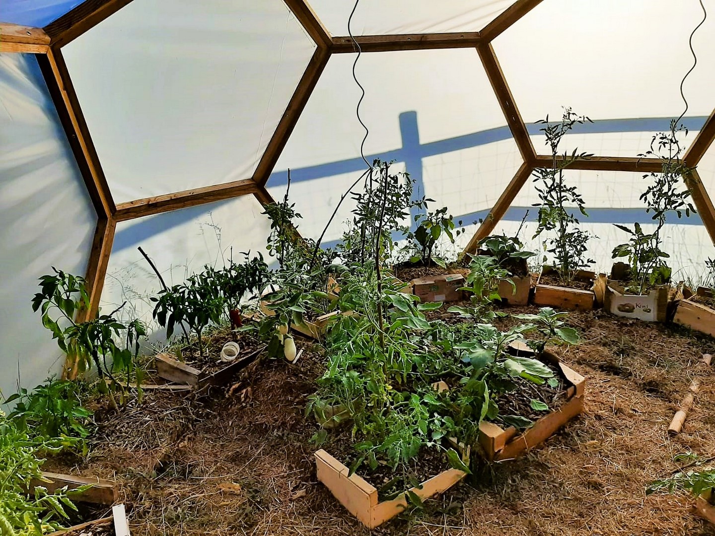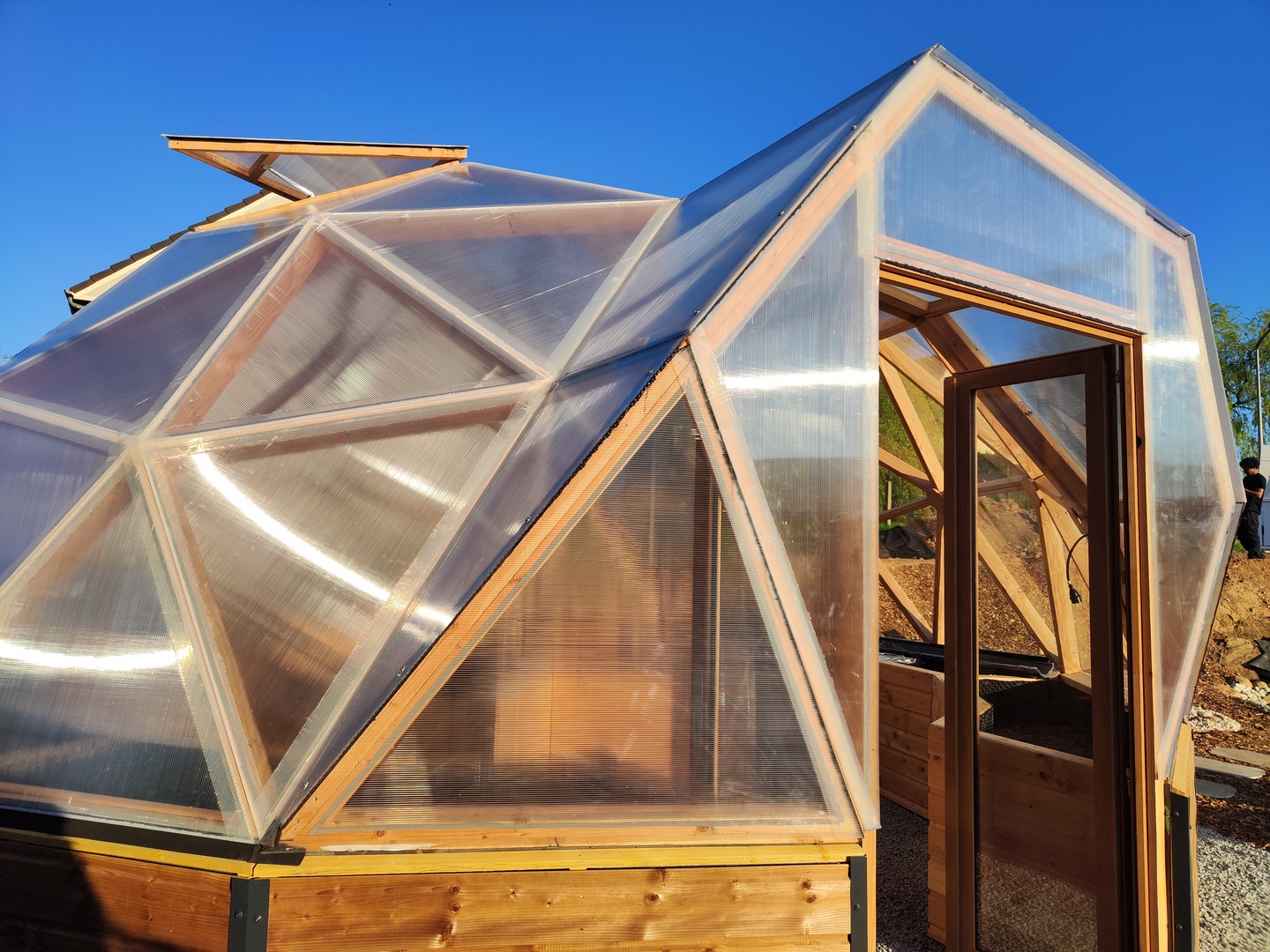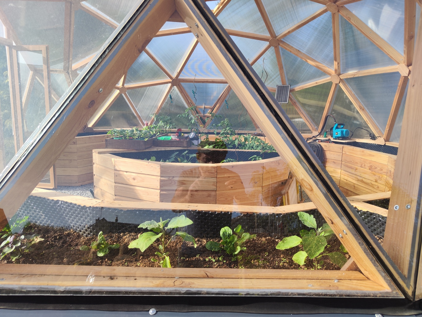 Dôme F3 5/12èmes de sphère sans connecteurs, sur réhausse 60 cm isolée, couverture en bardage bois et polycarbonate alvéolé, porte-fenêtre double battants 120 x 205, fenêtre sur vérins automatiques, jardinières périphériques et ilot central.