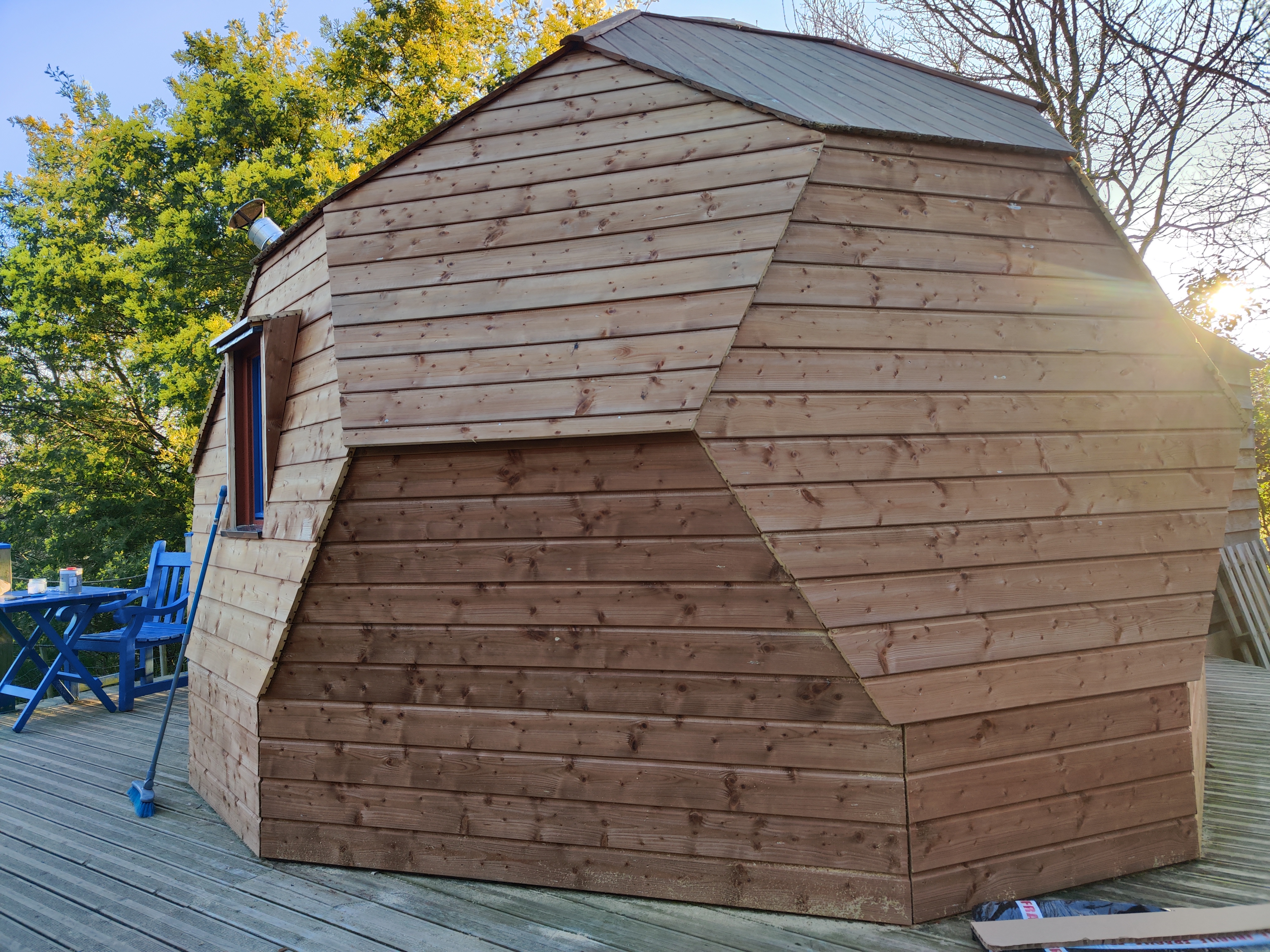sur réhausse, couvert en bardage bois, avec baie vitrée, isolé avec finition intérieure OSB